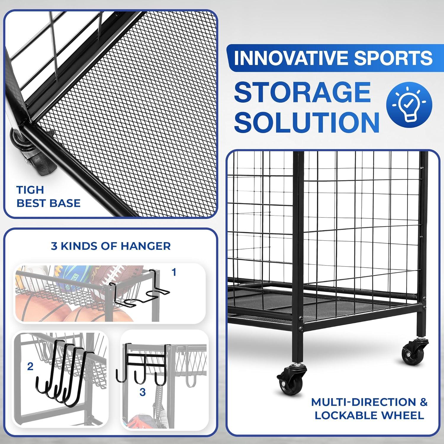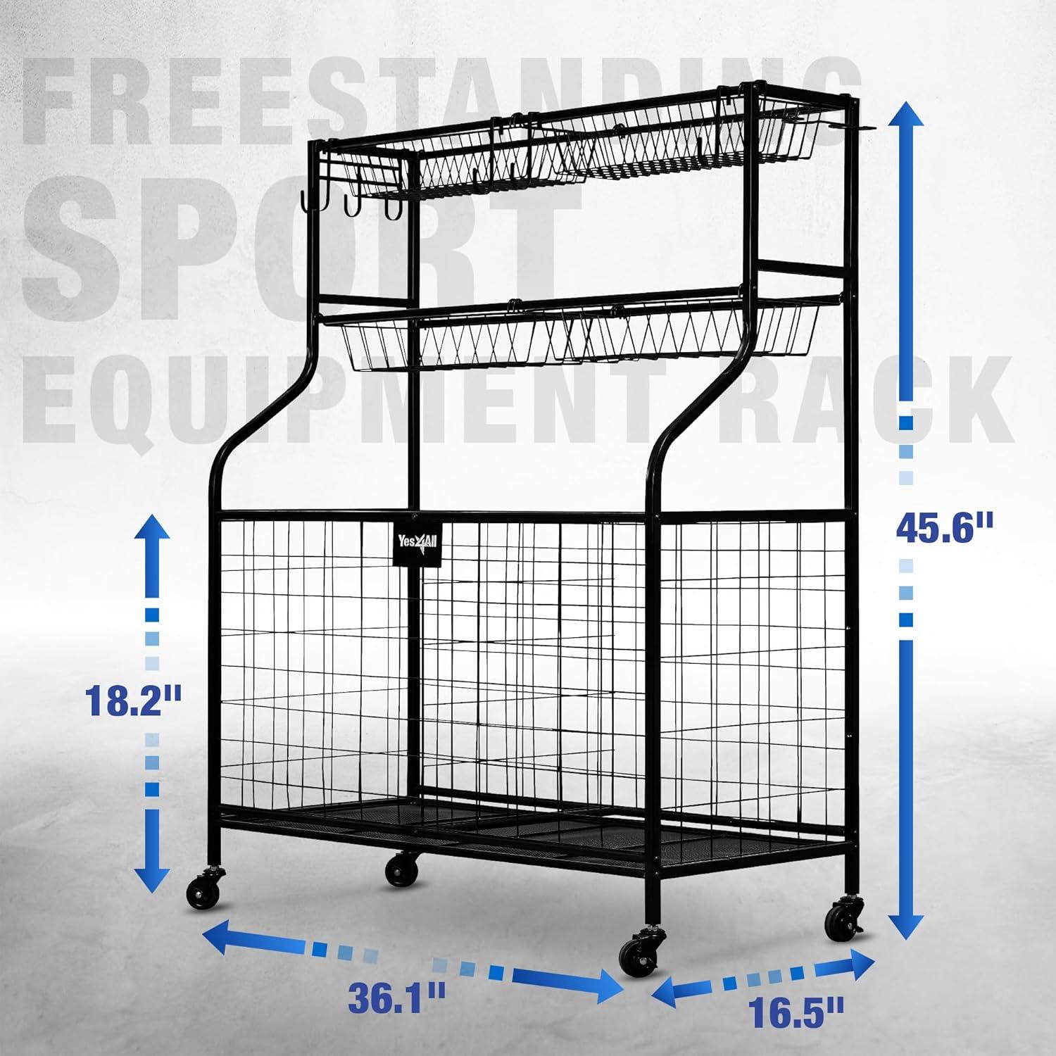 YES4ALL Sports Equipment Garage Organizer, Garage Ball Storage, Ball Cart, Ball Rack, Garage Organizer for Garage with Basket and Hooks, Rolling Sports Ball Storage Cart for Indoor/Outdoor Use, Steel