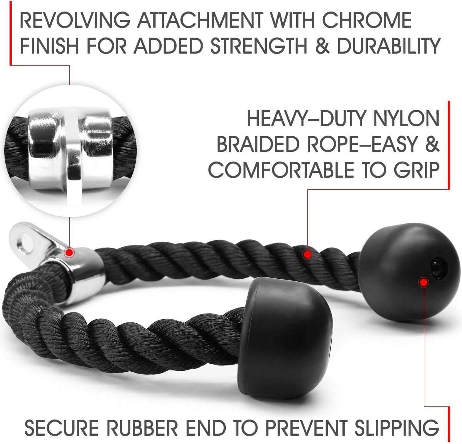 Yes4All Cable Machine Attachment, Row Handles, Tricep Rope, Straight Bar, V Bar, LAT Pulldown Accessories Load 880 LB for Home Gym(K. Black Tricep Rope 27″)